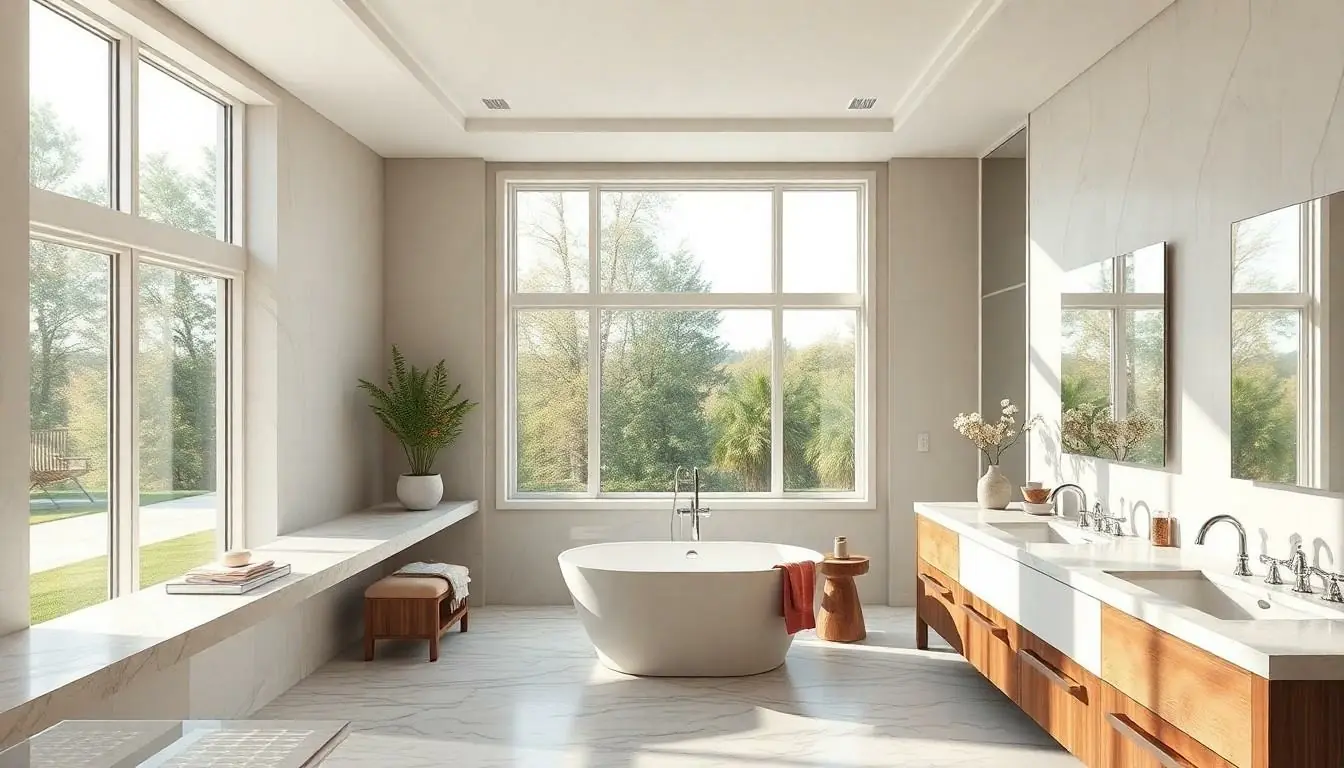 Arranging fixtures efficiently maximizes space. Placing double vanities across from each other allows for increased functionality and ease of use. Consider creating a dedicated zone for relaxation, featuring freestanding bathtubs or lounge chairs. Open floor plans enhance the spacious atmosphere, while including separate areas for the shower and toilet improves privacy. Incorporating built-in storage solutions helps maintain organization. Furthermore, allowing natural light to flow through large windows or skylights ensures warmth and vibrancy.
